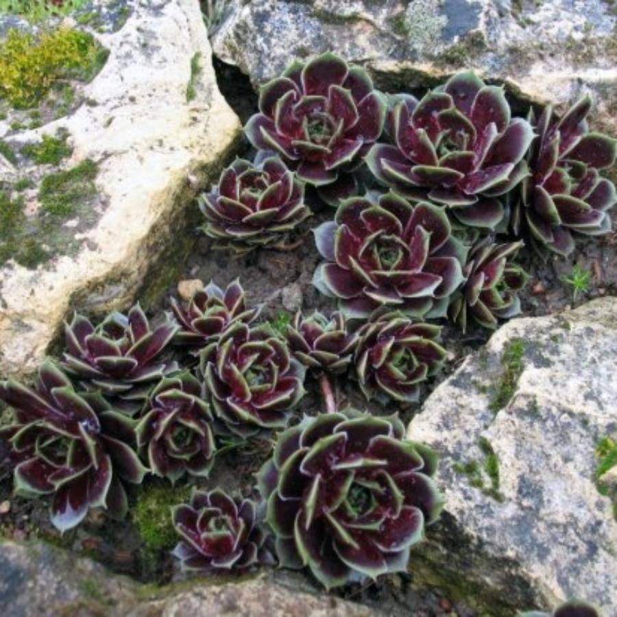 Молодило Vivalli - многолетнее травянистое почвопокровное растение. Розетки напоминают распустившуюся розу. Кайма сочных листьев зеленая, а серединка насыщенно-бордовая.