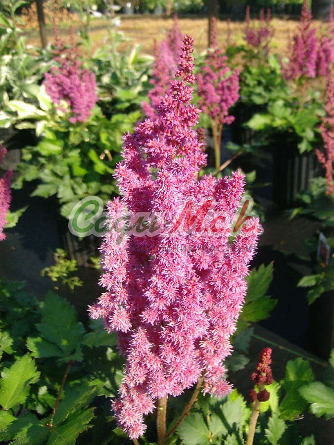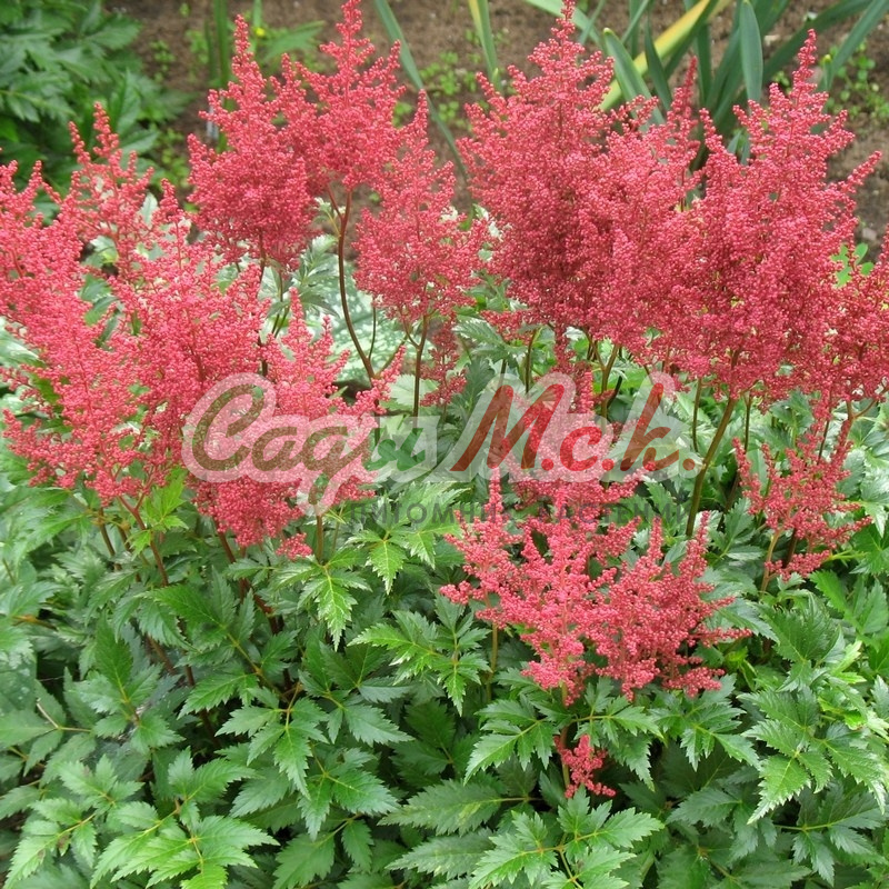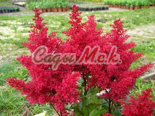 Астильба Арендса Glut - сильнорослый (до 85 см) сорт. Листья высотой - 35 см, весной буровато-красные, черешки и жилки коричневые. Соцветие ярко-карминно-красное на красноватой оси, средней плотности, длиной 35 см, метельчатое. Пыльники синеватые, тычиночные нити, пестики и чашелистики красные.