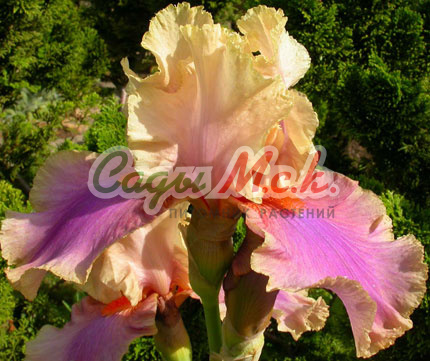 Ирис Весенняя мелодия раскрашен в самые модные оттенки сезона: его стандарты персиковые, с едва уловимым оттенком розового, а фолы облачились в насыщенный вишнёво-пурпурный цвет. Ободок фолов светло-розовый, ажурный. Яркая оранжевая бородка выполняет связующую роль в цветовом сочетании, предотвращая слишком контрастный переход от одного оттенка к другому. Таким образом, перед нами хоть и двуцветный ирис, однако с невероятно гармонично сочетающимися друг с другом цветами.<br>