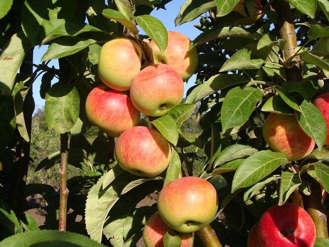 Яблоня Джин - среднего срока созревания. Яблоки среднего размера ярко-красные 120гр - 150гр шарообразной формы. Мякоть плодов ароматная, плотная и очень сочная, вкус кисло-сладкий, хороший десертный. Яблоки созревают в сентябре, а при правильном хранении, не теряют своих вкусовых качеств до февраля. Колоны яблони невысокие и малогабаритные, в высоту достигают около 2 метров. Урожайность хорошая. Первые 3-4 года около 4-5 кг с яблони. После 5 лет роста урожайность набирает полную силу и с дерева колоновидной яблони можно получить до 12-15 кг яблок.